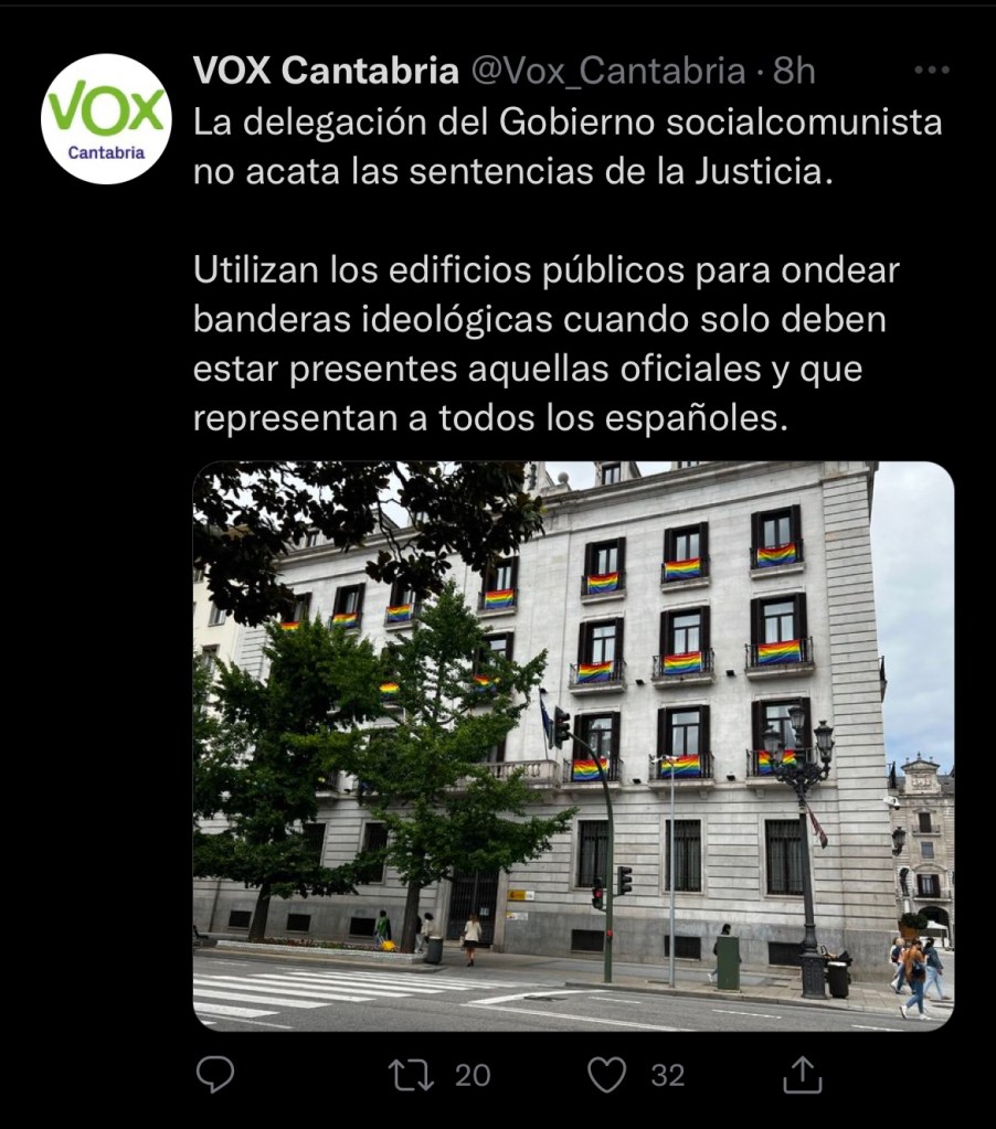 UNA BANDERA QUE REPRESENTA A UN COLECTIVO PERSEGUIDO Y SUPUESTAMENTE DEFENDIDO POR VOX PERO QUE MOLESTA SI SE ENSEÑA. Y PORQUE RESULTA IDEOLÓGICA?? PORQUE REPRESENTA AL COLECTIVO HOMOSEXUAL?? PERO SI TIENEN MUCHOS VOTANTES Y MILITANTES GAYS.