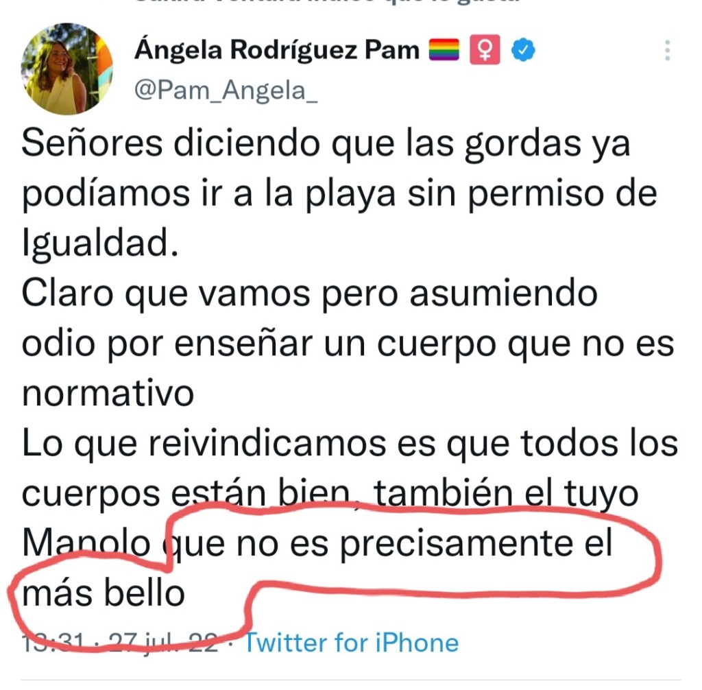 Y es que, además, parece ser que no hay hombres gordos ni con “cuerpos diferentes” o, como les gusta definir también hoy en día, “CUERPOS NO NORMATIVOS” que tengan derecho a disfrutar el verano… Y es que me resulta de escándalo que se invente problemas donde no los hay…