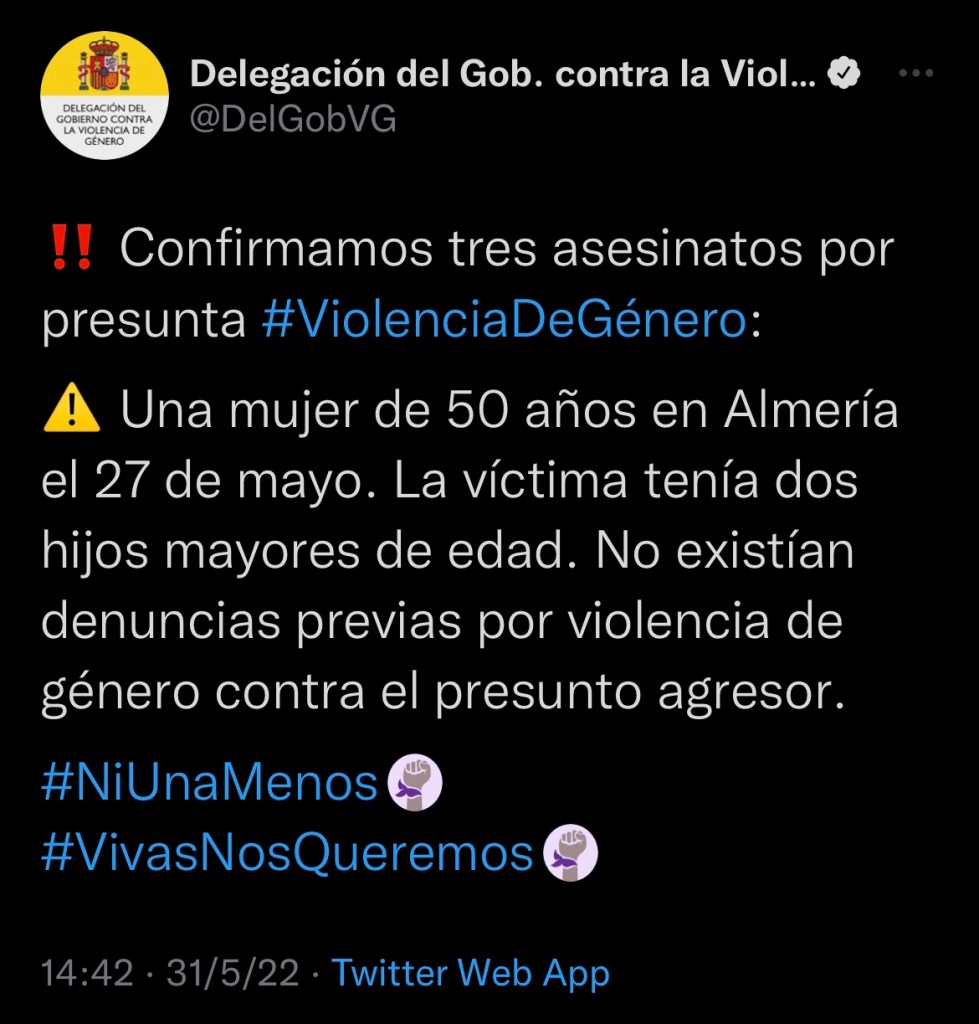 Ahora bien, todo hay que decirlo, nuestra querida ministra sabemos que contar si sabe. No hace falta demostrar nada en los casos de Asesinatos Machistas… aún no dejo de respirar la víctima y ya tiene un Tweet la ministra contabilizando otro caso más. Con colar la palabra “supuesta” en medio ya vale. Hoy mismo tenemos un ejemplo. Y ojo al Tweet: